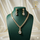 Discover the epitome of grace with this captivating ensemble from Ammaira Jewelz. This Carat polish necklace features a delicate strand of intricate Polki-style stones that leads to a magnificent, emerald-cut blush pink gemstone pendant surrounded by a halo of sparkling crystals. The matching earrings perfectly complement the look, featuring a subtle green accent stone that adds a touch of royal contrast. A perfect choice for cocktail parties, receptions, or adding a soft pop of color to your festive attire.