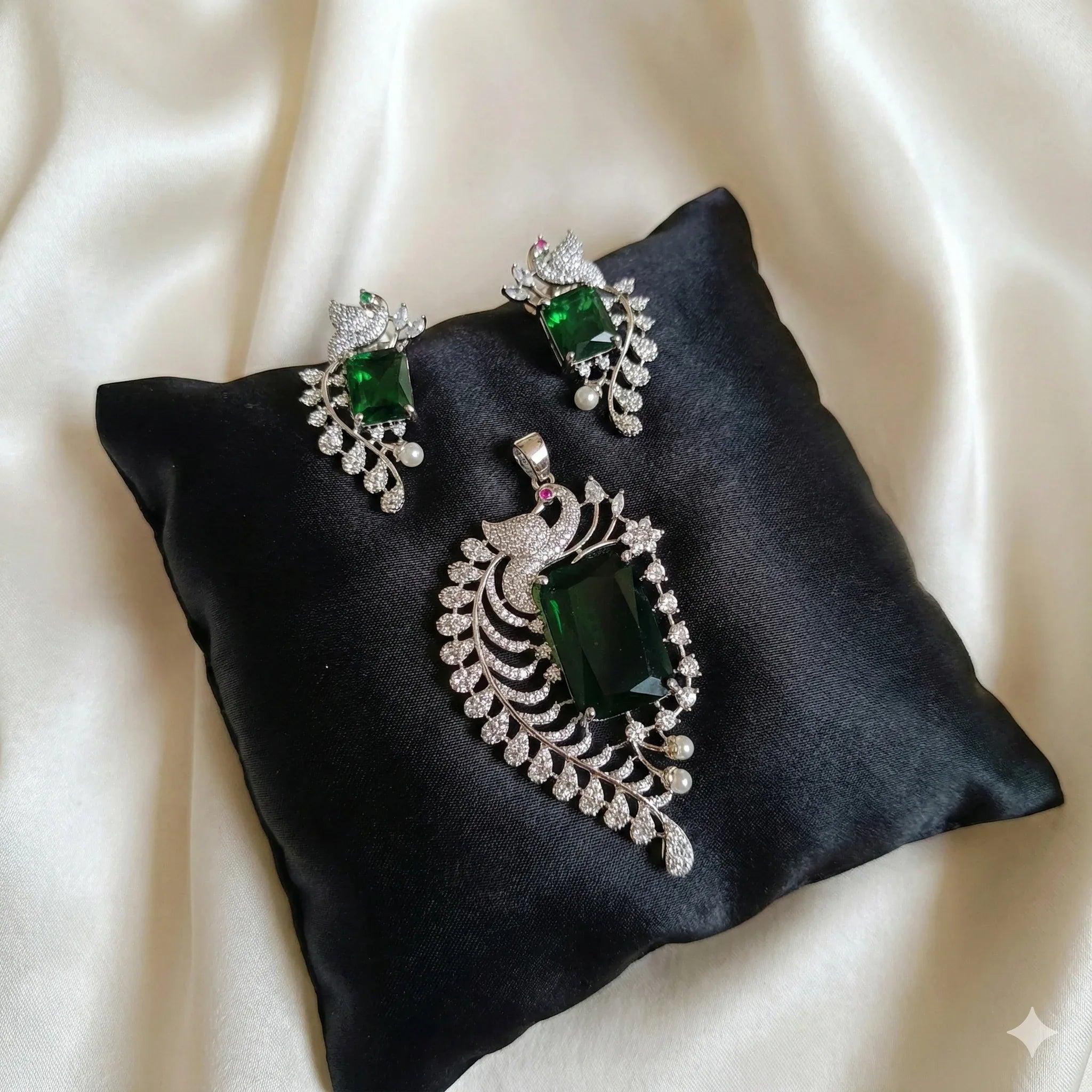 Ammaira’s Graceful Peacock Motif Silver Plated AAA AD Zirconia Pendant Set