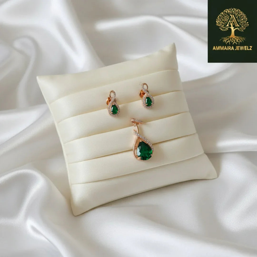 AMMAIRA"S The Emerald Leaf Set: Geometric Pendant & Coordinating Earrings in Rose Gold