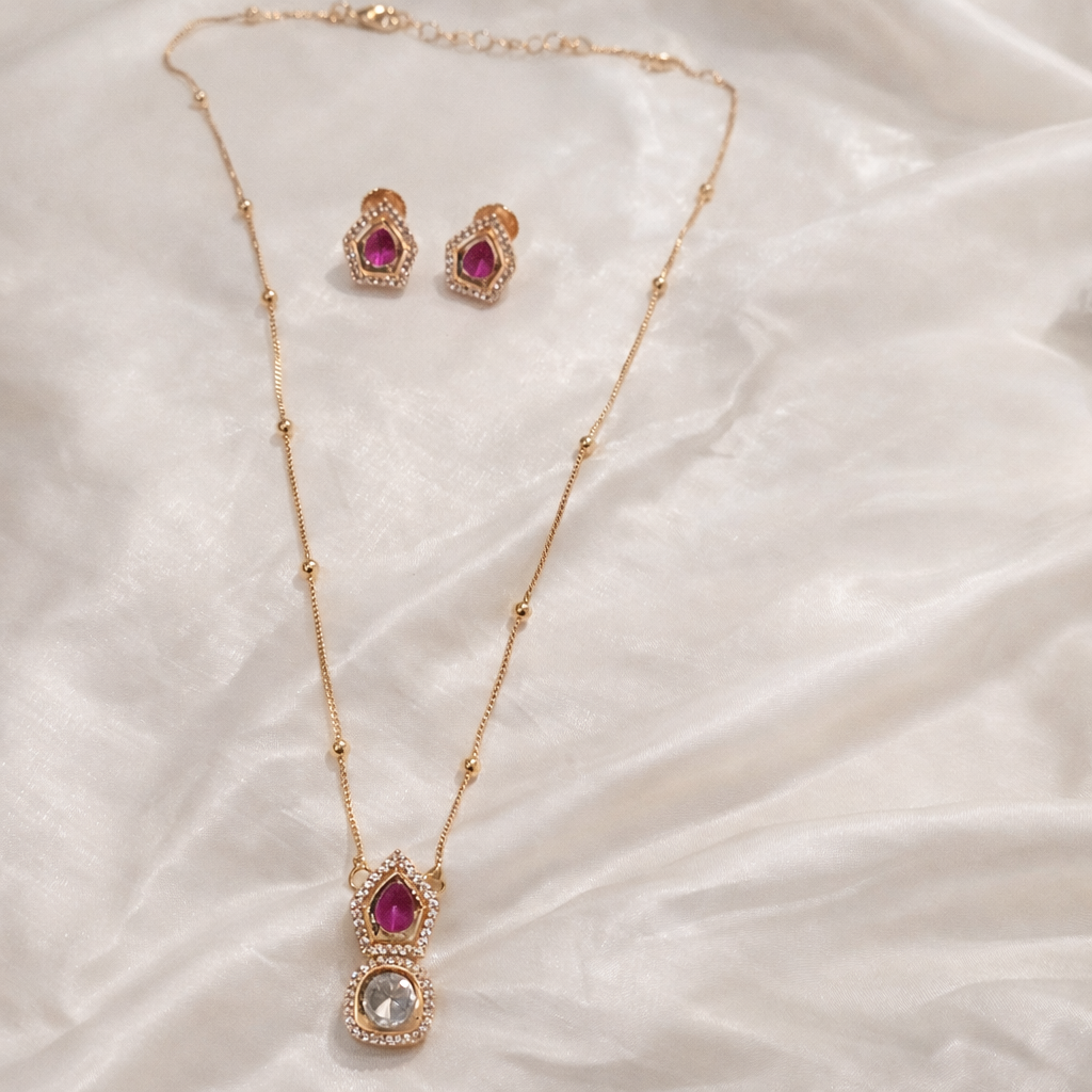 The pendant showcases a graceful dual-drop silhouette, enhanced with intricate halo accents that amplify brilliance and depth. Paired with perfectly matched stud earrings, the set offers balanced sophistication for bridal occasions, festive celebrations, and heirloom-inspired styling.