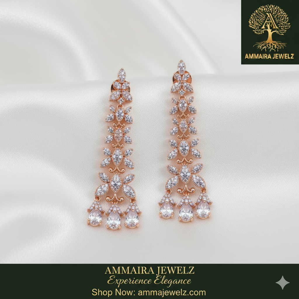 Introducing The Blossom Cascade Drops, an exquisite pair of earrings designed to bring a touch of floral grandeur to your look. These magnificent long drops are crafted in a warm Rose Gold finish and feature a captivating, multi-tiered design of brilliant white accent stones.