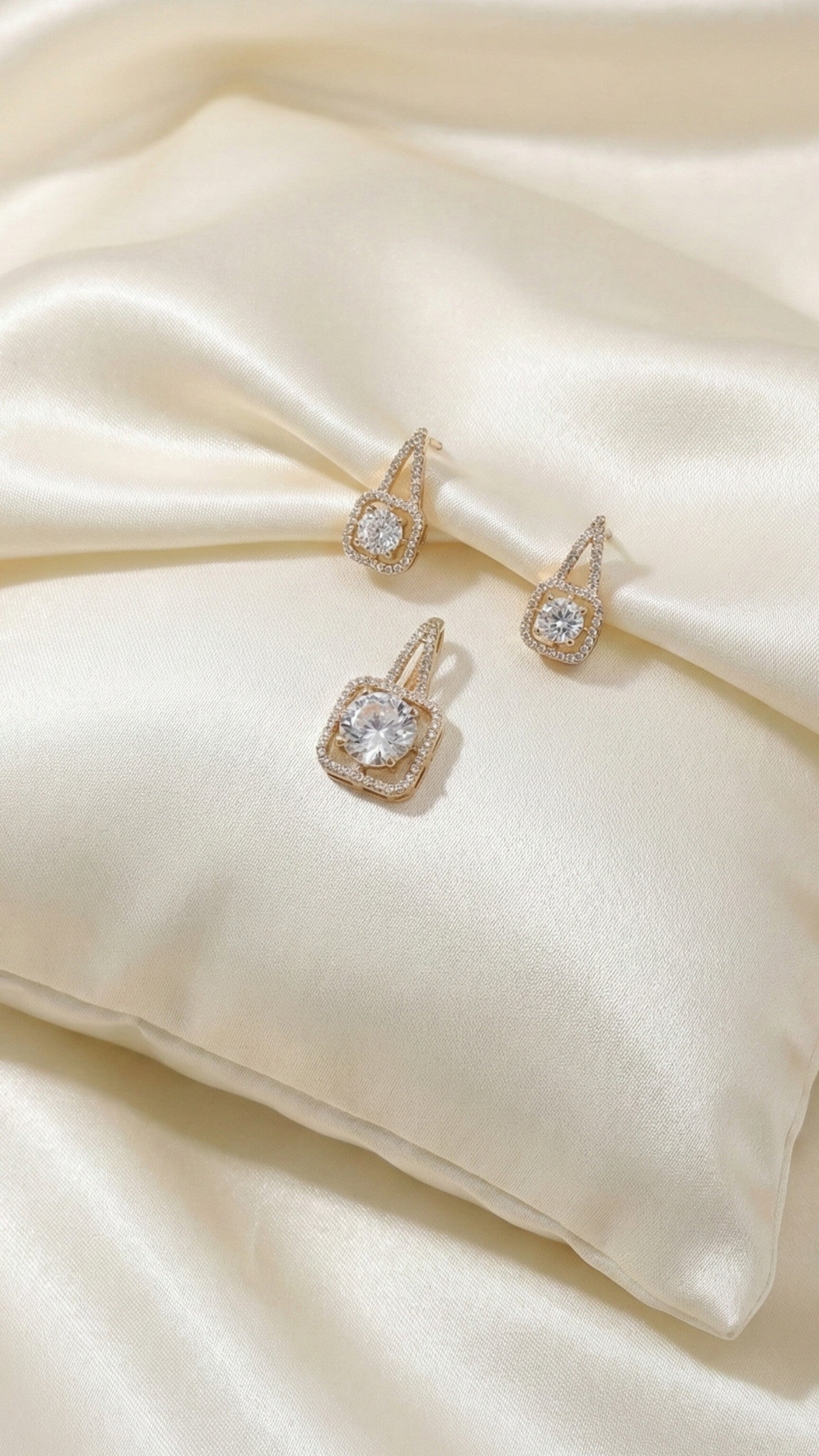 Radiate timeless sophistication with this exquisite Rose gold-tone pendant set. The centerpiece features a brilliant round-cut solitaire stone, beautifully framed by a square halo of sparkling cz diamonds. This geometric design adds a modern touch to a classic look, creating a captivating play of light. The set includes a matching pair of elegant earrings, making this Ammaira Jewelz creation a perfect choice for adding a touch of refined luxury to any ensemble.