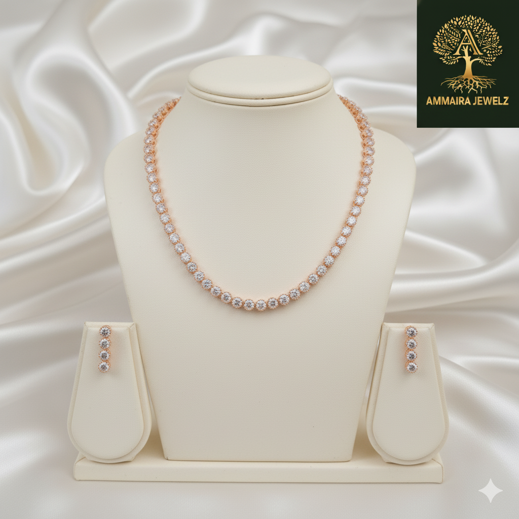 Embrace timeless romance with this radiant Rose-Gold-Polish tone necklace set. This exquisite piece features a continuous strand of brilliant, round clear stones, each nestled in a delicate "rose petal" halo of sparkling crystals. The matching drop earrings echo the same floral-inspired design, creating a look of pure, sophisticated sparkle. This Ammaira Jewelz set is an elegant choice, perfect for a bride, bridesmaid, or any formal event.