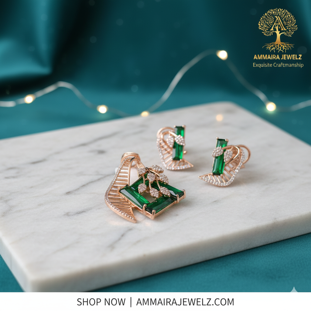 Introducing The Emerald Leaf Set, a striking jewelry ensemble featuring a coordinated pendant and stud earrings. This set showcases a sophisticated contrast between the warm Rose Gold finish and the rich, vibrant color of the Emerald-hued stones.