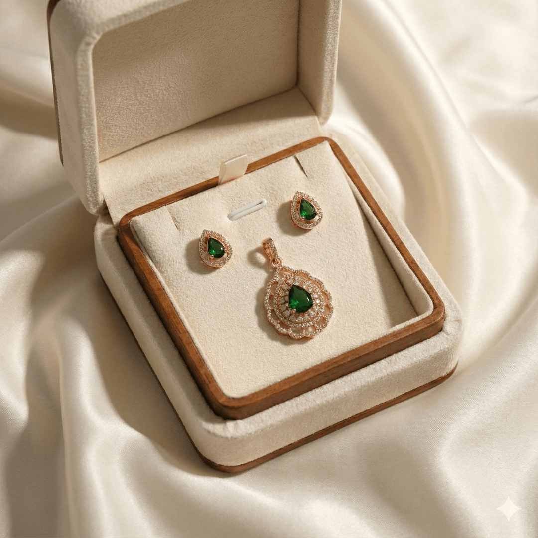 Capture the essence of regal beauty with this stunning emerald green pendant and earring set from Ammaira Jewelz. Framed in lustrous rose gold with intricate filigree detailing and a sparkling crystal halo, the deep green teardrop stones offer a luxurious touch to any ensemble. This timeless design is perfect for festive celebrations and makes a cherished gift for loved ones.
