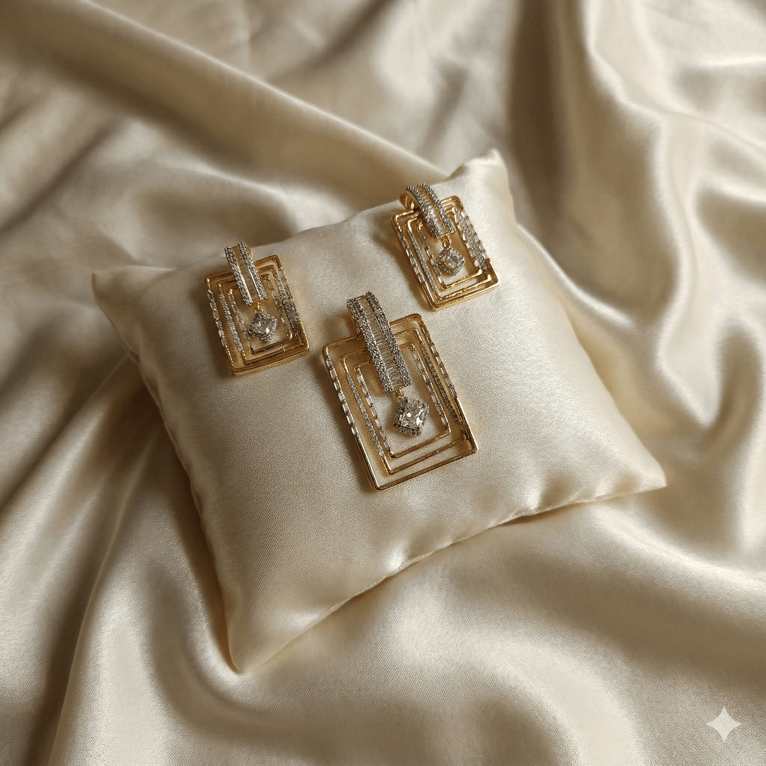 Make a sophisticated statement with this stunning geometric pendant and earring set. Featuring a contemporary design of nested rectangular gold-tone frames, this set is highlighted by a central vertical bar encrusted with sparkling American Diamonds (AD) and a solitaire drop accent. The structural elegance of this piece makes it the perfect accessory for modern office wear, evening dinners, or chic gatherings.