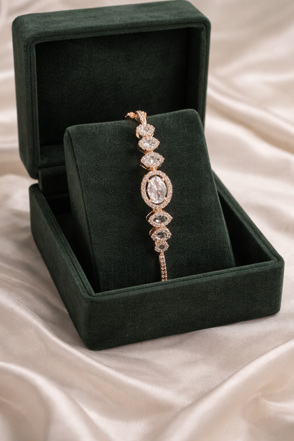 Add a touch of refined sparkle to your jewellery collection with this elegant openable bracelet from Ammaira Jewelz. Designed with a graceful oval crystal center, marquise accents, and delicate diamond-look detailing, this bracelet brings timeless rose gold beauty to every outfit.