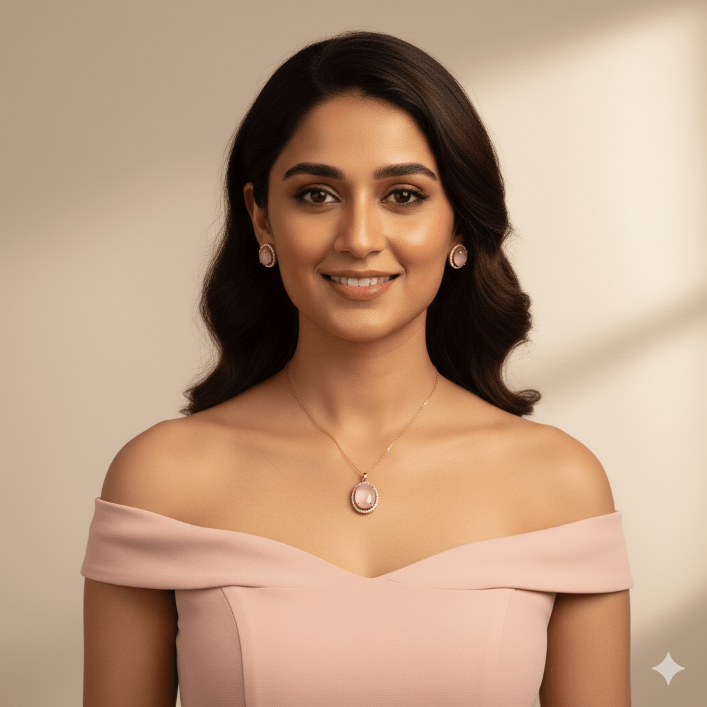 Embrace soft sophistication with this stunning pendant and earring set, exclusively from Ammaira Jewelz. Featuring a luminous, oval-cut pink gemstone surrounded by a delicate halo of shimmering crystals, this set is finished in luxurious rose gold plating. The gentle pink hue captures the light beautifully, making it the perfect romantic accessory for a dinner date or a refined touch to your office attire. Timeless, feminine, and effortlessly chic.