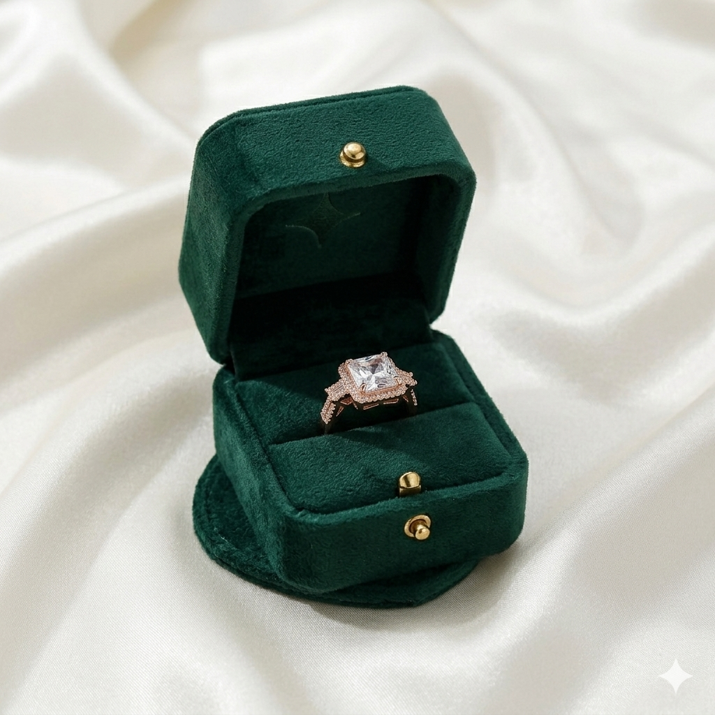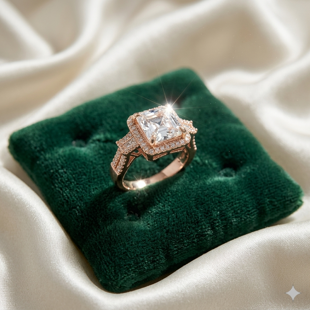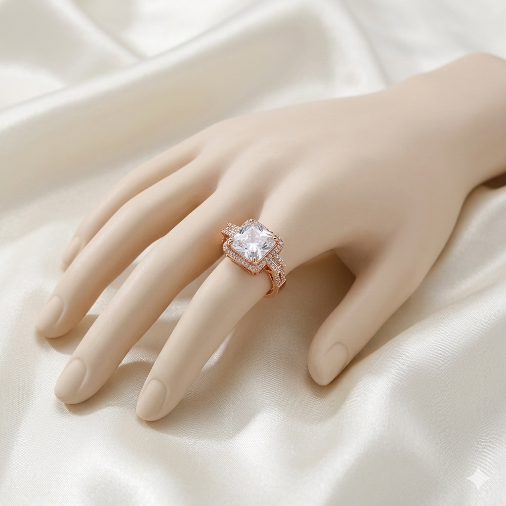 Make every look feel luxurious with this stunning statement ring from Ammaira Jewelz. Designed with a brilliant princess cut crystal center and delicate diamond-look detailing, this ring brings soft sparkle and timeless elegance to your jewellery collection.